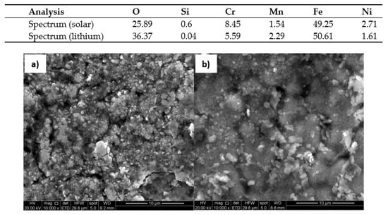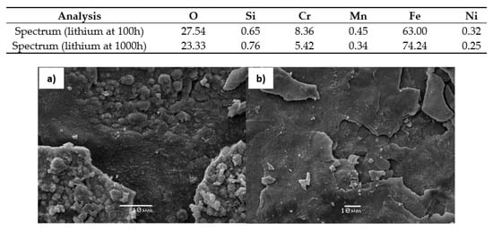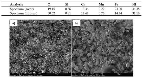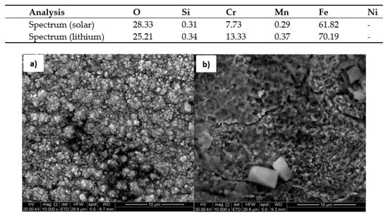 The corrosion models mentioned in the article were confirmed by scanning electron microscopy SEM Inspect F50 (Scientific and Technical Instruments, Wilsonville, OR, USA). Figure 18 and Figure 19 show the surface appearance of the AISI 304 and AISI 430 material after 100 h of exposure to both solar salt and the ternary lithium mixture, as well as an energy dispersive x-ray EDX analysis of the particles found on the surfaces. The layers of oxide formed are homogeneous in the same cases. The EDX analysis of the material on the surface indicated that the composition of the oxidation layer analysed was iron oxide and chromium, and therefore the presence of a protective layer was confirmed. Figure 20 shows the surface appearance of the nickel-based HR-224 alloy after 100 h of exposure for solar salt and for the ternary lithium containing molten salt, including EDX analysis of the surface. The oxide layer found shows a totally homogeneous layer in both cases. According to the EDX analysis of HR-224, it was shown to be composed of nickel, chrome, oxygen, and iron. Finally, Figure 21 shows the surface appearance of ferritic steel VM12 immersed in lithium nitrate molten salt for 100 and 1000 h of exposure. The oxide layer for 100 h shows a more homogeneous surface with respect to the 1000 h sample, where some areas with detachment of the corrosive layer are shown, due to the longer exposure times. According to the EDX analysis it shows a composition of mainly iron, oxygen, and chromium. The SEM images have been obtained by means of backscattered electron microscopy.