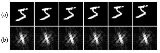 Spatial images and their corresponding frequency images. (a) spatial images of a zero-pixel shift to 5-pixel shifts from the center, (b) their corresponding frequency images having the same appearance.
