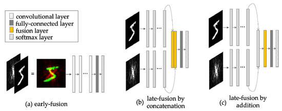 The early-fusion strategy learns features by feeding two heterogeneous sets of information together as the input. Meanwhile, the late-fusion strategy learns features by feeding each heterogeneous input image separately.
