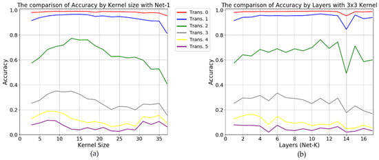 The accuracy of the networks tested with N-pixel translated (depicted by Trans. N) images. (a) for the deep networks with varying convolutional layers of up to 17 with the same 3 × 3 kernel size, (b) for the Net-1 network with varying kernel sizes of up to 37.