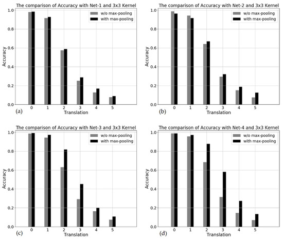 The comparison of networks with and without max-pooling by varying network depth with the same 3 × 3 kernel size. (a–d) for the Net-1, Net-2, Net-3 and Net-4 networks, respectively.