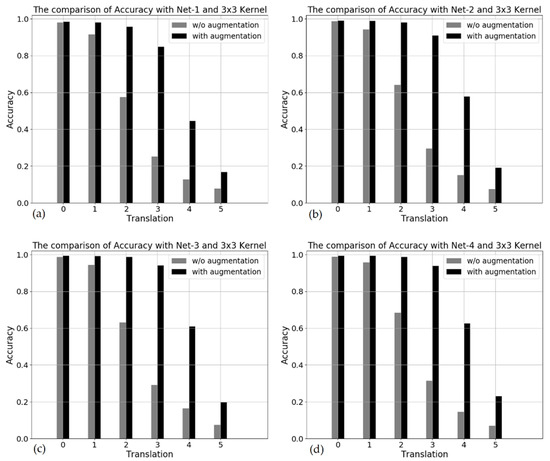 The comparison of networks with and without augmentation within 2-pixel translation by varying network depth with the same 3 × 3 kernel size. (a–d) for the Net-1, Net-2, Net-3 and Net-4 networks, respectively.