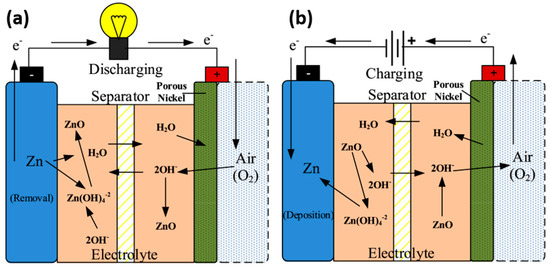 Schematic of a zinc–air battery under (a) discharging and (b) charging conditions [36]. Copyright 2017, Elsevier.