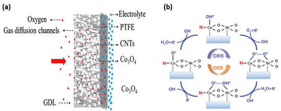 The spinel structures with cobalt in the octahedral sites are more resourceful for the OER and ORR, and copper-based materials have exhibited excellent ORR and OER catalytic activity due to the intense interfacial contact of Cu and its surroundings [64,65]. In Cheng et al.’s work, nitrogen-doped carbon nanotubes were ornamented by spinel CuCo2O4 quantum dots (CuCo2O4/N-CNTs) with successful Co3O4 doping without changing its crystalline structure. Carbon nanotubes (CNTs) are used to confer high electrical conductivity, large surface area, and intrinsic flexibility. The CNTs are doped to solve the problem of weak catalytic performance. CuCo2O4/N-CNTs was tested in liquid alkaline and a solid-state electrolyte because of its ORR (onset potential of −0.04 V, the large diffusion-limited current density of −5.53 mA⋅cm−2, and low Tafel slope of 76.53 mV⋅dec−1) and OER (−0.61 V with a potential of 0.69 V to get 10 mA⋅cm−2 and low Tafel slope of 118.80 mV⋅dec−1 compared with Co3O4/N-CNTs, CuO/N-CNTs, and CuCo2O4). The capability of Cu and Co as ORR and OER catalysts gives a ΔE value of 0.90 V. It is evident from the analysis of the other materials that CuO/N-CNTs outperform the Co3O4/N-CNTs in ORR, and the reverse was true for OER.
