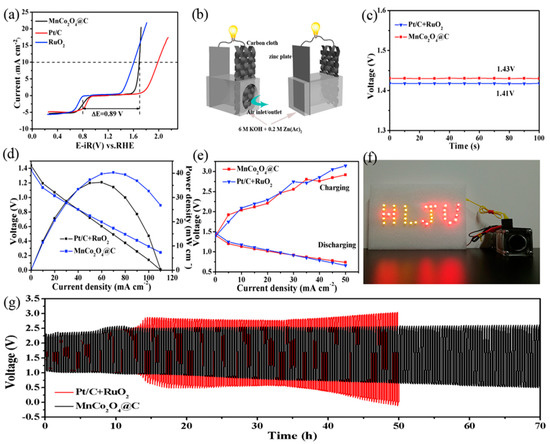 Cui Shenghai et al. coated carbon on MnCo2O4 nanowire by self-templating from a NiCo2O4-nitrogen triacetic acid (MnCo2-NTA) nanowire precursor. The resulting material, MnCo2O4@C, showed better ORR than MnCo2O4. The authors proposed that the improved ORR was attributable to the conductivity of MnCo2O4@C nanowire, where the carbon layer helped in the electron movement of MnCo2O4 nanoparticles, thereby decreasing the charge transfer resistance. Additionally, the porous texture and large surface promoted the diffusion of mass transfer and enlarged the triple-phase contact area, and the rigid carbon shell provided mechanical strength to gain progressed stability. The evaluated bifunctionality ΔE, which is a small difference, is the reason for excellent reversibility in oxygen electrocatalysis. The authors obtained galvanostatic charge–discharge plots at 10 mA cm−2 and power density status that revealed admirable stability of 70 h in a homemade ZAB (Figure 5) [54].