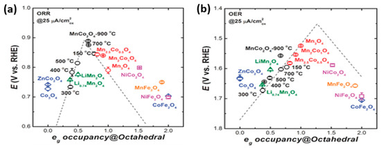 Chao Wei et al. stated that the eg occupancy of the active cation in the octahedral site is the activity descriptor for the ORR/OER of spinels, consolidating the role of electron orbital filling in metal oxide catalysis. The spinel structure affords multiple sites for transition-metal cations and an extensive range of valence states to give rise to a large number of oxides. In this work, the researchers varied the temperature to tune the electronic structure of MnCo2O4 cubic spinels, which they prepared by solid-state chemistry. Activity on spinel as a function of the Mn valence state of the active element at the octahedral site resulted in a volcano shape, as displayed in Figure 6a,b. Hence, it was demonstrated that eg theory applies to not only the perovskite family but also to the spinel family [63].