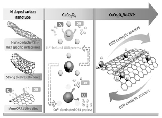 To learn the role of the N-CNTs, researchers performed electrochemical impedance spectrum (EIS), electrochemical double-layer capacitance (Cdl), and XPS analysis. In the findings, with lower resistance (EIS) and greater capacitance (electrochemically active surface area) along with BET measurement (11.18 m2 g−1), N-CNT provided a large surface area and restricted the aggregation and bonding between N and Cu; additionally, Co offered pyridine nitrogen for good ORR by generating more catalytic sites in CuCo2O4. The catalytic process of CuCo2O4/N-CNT is illustrated in Figure 7. Further, the authors measured the chronoamperometry and chronopotentiometry to identify the stability and used a rotational ring disk electrode to identify the number of electrons transferred.