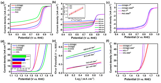 (a) ORR polarization curves of L-CuCo2O4@C, CuCo2O4@C, H-CuCo2O4, and Pt/C samples. (b) ORR polarization curves of the CuCo2O4@C nanotubes at different rotation speeds and the corresponding K−L plots at different potentials (inset). (c) ORR polarization curves of CuCo2O4@C and Pt/C samples before and after 3000 potential cycles. (d) OER polarization curves of L-CuCo2O4@C, CuCo2O4@C, H-CuCo2O4, IrO2, and the overpotential schematic at 10 mA cm−2 (inset). (e) Tafel plots derived from (d). (f) OER polarization curves of CuCo2O4@C and IrO2 during the cycling durability test [66]. Copyright 2017, American Chemical Society.