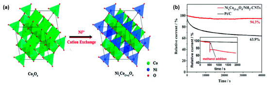 (a) Illustration of crystal phase preservation during cation exchange. (b) Chronoamperometric curves of the NixCo(3x)O4/NH2-CNTs and Pt/C at 0.7 V. The inset shows the Chronoamperometric curves of the NixCo(3x)O4/NH2-CNTs and Pt/C with the addition of 1.0 M methanol into O2-saturated 0.1 M KOH [67]. Copyright 2013, Royal Society of Chemistry.