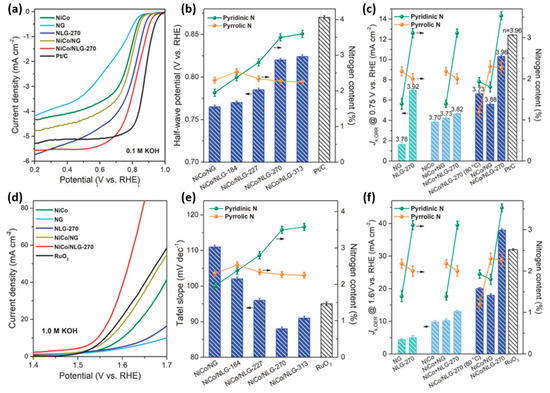(a) ORR linear sweep voltammetry (LSV) curves of NG, NLG-270, NiCo2O4 NPs, NiCo/NG, NiCo/NLG-270, and Pt/C, in 0.1 M KOH solution (rotation rate: 1600 rpm). (b) ORR half-wave potential of the hybrid catalysts with different contents of pyridinic and pyrrolic N bonded with Co ions, and Pt/C. (c) Comparison of the kinetic currents and the electron transfer number for the ORR process of the control samples, along with the corresponding contents of pyridinic and pyrrolic N bonded with Co. (d) ORR LSVs of NG, NLG-270, NiCo2O4 NPs, NiCo/NG, NiCo/NLG-270, and Pt/C, in 1 M KOH solution. (e) OER Tafel plots of the hybrid catalysts with different contents of pyridinic and pyrrolic N bonded with Co ions, and RuO2. (f) Comparison of the kinetic currents for the OER process of the control samples, along with the corresponding contents of pyridinic and pyrrolic N bonded with Co [45]. Copyright 2018, John Wiley and Sons.
