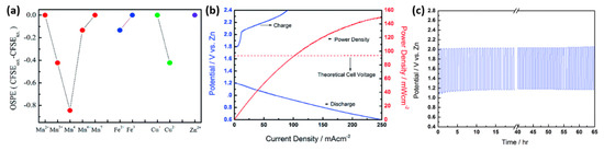 (a) The Octahedral site preference energy (OSPE) diagram of Mn, Fe, Cu, and Zn ions at various oxidation states. (b) The discharge–charge profiles under galvanodynamic (1 mA⋅s−1) mode and the corresponding power density profile for the ZAB using the FNCO-01-coated air electrode under ambient air and (c) the steady-state discharge–charge profile under galvanostatic (10 mA⋅cm−2, 40 min per cycle) mode for a ZAB using the FNCO-01-coated air electrode in 6 M KOH and 0.2 M Zn(CH3COO)2 in ambient air [40]. Copyright 2013, Royal Society of Chemistry.