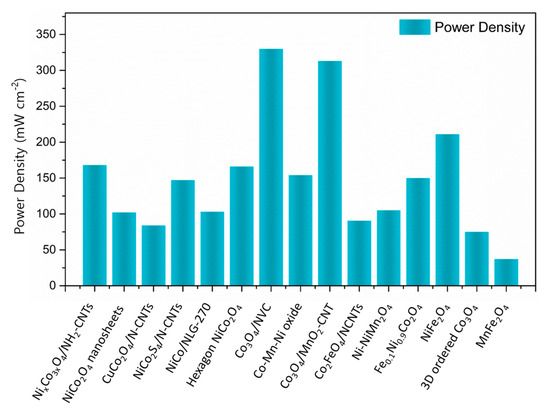 In the above reports, researchers designed various spinel structured cathode materials with different morphologies and compositions that greatly improved their OER and ORR performance. Table 1 summarizes the recent research on the bifunctional electrocatalytic activity of the spinel-structured compounds in ZABs, and Figure 13 presents the ZAB power densities for the varied spinels as the electrocatalysts. In summary, spinel-based compounds that consist of Ni, Mn, Cu, and Fe at the A site and Co, Mn, Fe, Ni at the B site with oxygen at the X site have been widely used in ZABs as electrocatalysts. Other halogens can replace the X site, for instance, selenide, sulfide, and nitride. With the better bifunctional activity of spinels, strategies such as improving porosity and surface area, nanostructuring, carbon coating, doping with nitrogen, phase change, etc., could greatly improve the catalytic activity.