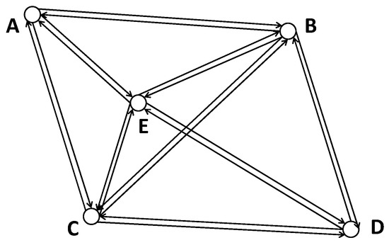 where represents the total number of airports. The network is completely connected when , and the connectivity of the network is the worst when . Therefore, the value of is . is the connectivity efficiency between airports and . It can be calculated by the shortest path between and . can be calculated by the Floyd algorithm [39]. The algorithm starts from any one-sided path. The distance between any two points is the weight of the edge. When and are disconnected, tends toward infinity and .