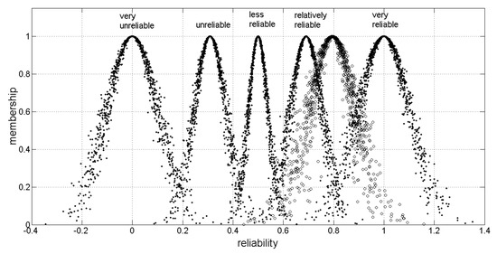 The membership fuzzy sets are shown in Figure 6. Fuzzy sets with “.” correspond to five rules, and fuzzy sets with “o” correspond to the reliability of the US air traffic network.