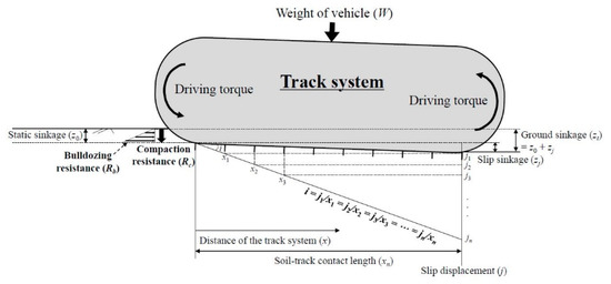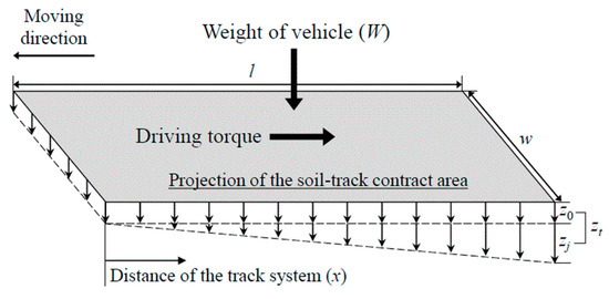 The track system, namely, the mobility system of off-road tracked vehicles, transfers driving torque and vehicle weight (W) to the ground (Figure 1). The driving torque shears the ground and the vehicle’s weight exerts a vertical force. From the view point of terramechanics, driving torque and vehicle weight can be expressed by longitudinal and vertical force on the soil–track interface, respectively [2]. The tractive performance of off-road tracked vehicles is reduced by the shearing action and sinkage caused by these forces.