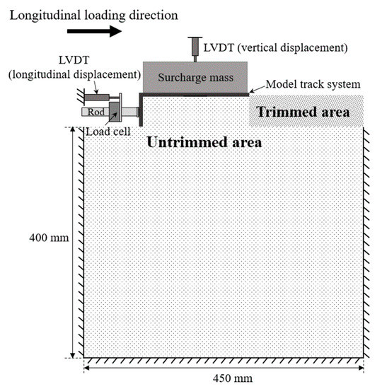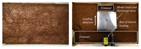 As shown in Figure 5, the homogeneous model ground created through the above process was trimmed to a form of the soil block and soil channel where the target track system shears off. The model track system was then installed on the model ground. As ground shearing occurs independently due to the single-track system during off-road tracked vehicle driving, the ground after the track-loaded area in the traveling direction was removed to exclude the effects of this area [18]. A schematic drawing of the model track experiment (i.e., the shape of the trimmed model ground and experiment set-up) is presented in Figure 6.