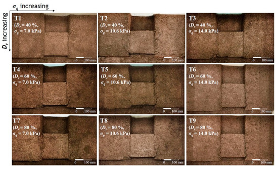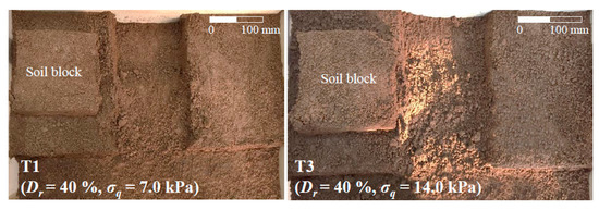 Excluding the slight upward slip sinkage that occurred at the beginning of shearing for T4 (relative density of 60% and vertical stress of 7.0 kPa), downward slip sinkage occurred under all test conditions. The extent of the downward slip sinkage increased with slip displacement. However, the rate of increase gradually decreased. This behavior is similar to the tendency of the increase in vertical displacement of the soil sample as shearing progressed in the direct shear test. However, while upward vertical displacement is normally observed in the direct shear test for dense soil due to the volumetric expansion [31], in this experiment, downward slip sinkage also occurred in soil with a relative density of 80%. This is because unlike the sample of the direct shear test, in which all sides are rigidly constrained, the soil block is rigidly constrained only on the side on which the grouser is located, resulting in a volumetric change in all unconstrained directions.