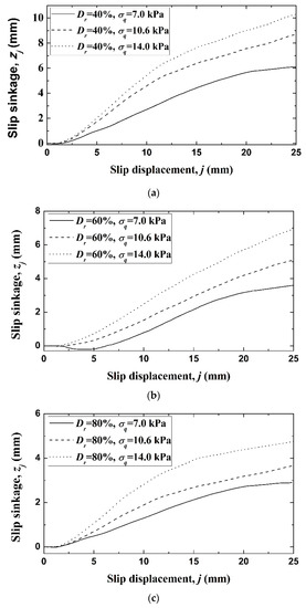 Slip sinkage and slip displacement relationships for (a) Dr = 40%, (b) Dr = 60%, and (c) Dr = 80%.