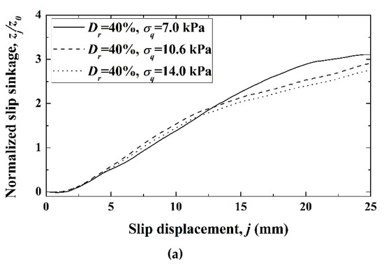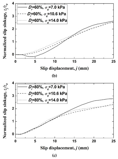 Figure 9 shows the slip sinkage (zj)-slip displacement (j) relationships assessed through the vertical and longitudinal displacement measured in the model experiments. (Downward slip sinkage is denoted using positive values); here, a Savitzky–Golay filter [30] was applied for the purpose of smoothing the data.