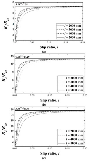 Figure 14 presents plots of the normalized compaction resistance considering the slip sinkage Rc/Rc0 with respect to i when l = 2000, 3000, 4000, and 5000 mm, with n = 0.5 (Figure 14a), 1.0 (Figure 14b), 1.5 (Figure 14c), and 2.0 (Figure 14d). Under all conditions, Rc/Rc0 increased gradually from 1 as i increased. This is because as i increases, the function in the integral sign of Equation (13) increases. In particular, at i = 0.2, a common basis to compare the performances of off-road tracked vehicles [2], Rc/Rc0 converges to 3.78n + 1. Accordingly, under the analytical conditions applied in this study, overall compaction resistance Rc was 7.35 (n = 0.5) to 54.01 (n = 2.0) times greater than compaction resistance Rc0 due to static sinkage. These results indicate that the effect of slip sinkage should be considered when assessing the tractive performance of off-road tracked vehicles and that tractive performance can be overestimated when compaction resistance is calculated considering only static sinkage. When excessive slip sinkage is expected with a large i, it is necessary to apply a proper method to suppress the effect of slip sinkage such as unconventional track suspension systems [35,36,37,38].