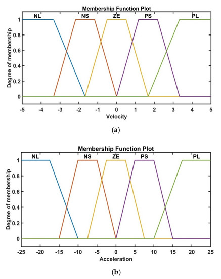 The state variables, sprung mass velocity and accelerations used in this work are measured by using velocity sensors or accelerometers. The sprung mass velocity and acceleration are measurable typically and, hence, considered as the input variables. Therefore, the sprung mass velocity error, i.e., (-0), is denoted as ‘Ve’, and the error of derivative (-0) is denoted as ‘Ce’, i.e., the sprung mass acceleration (), were chosen as inputs. For the fuzzy logic design, the linguistic variables of the input membership functions were taken as: Negative Large (NL), Negative Small (NS), Zero (ZE), Positive Small (PS) and Positive Large (PL). Similarly, the linguistic variables of the output membership functions were taken as: Positive Very Small (PVS), Positive Small (PS), Positive Medium Small (PMS), Positive Medium (PM), Positive Medium Large (PML), Positive Large (PL) and Positive Very Large (PVL). Membership functions were chosen on the basis of the literature [14,18,27,28], the trial and error method and the experience of the authors and are shown in Figure 3.