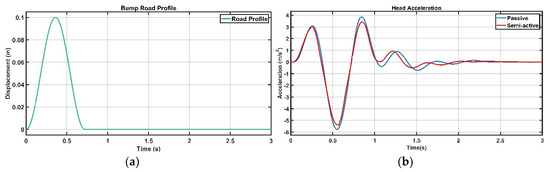 In Equation (20), is the amplitude of the bump, which is 0.1 m, the velocity ) of the vehicle which is taken as 30 km/h. The driver’s head acceleration response for the bump input at different velocities for semi-active and passive seat suspension is shown in Figure 5b,d,f. In Figure 5, passive represents the passive seat suspension without any controlled damper, whereas semi-active represents the semi-active seat suspension with the MR damper controlled by FLST-PID. For instance, the semi-active seat suspension reduces the peak-to-peak value of the head acceleration by 7.68%, as compared to that of the passive seat suspension only, improving the ride comfort in case of a bump road profile at 30 kmph vehicle speed. Although this percentage reduction is value is not very large; such an observation is due to the inclusion of the vehicle suspension model in the proposed integrated seat suspension model. In this study, we give the bump profile with a 0.1 m amplitude road input to the wheels of the vehicle and suspension damper, suppressing the vibrations at first, and then the displacement of the sprung-mass Zs actually serves the input to the seat suspension system. Much previous work reports road input directly applied to the seat suspension as the disturbance and this may lead to larger values of percentage reduction of the head acceleration of the semi-active seat suspension, as compared to that of thee passive system. Therefore, the proposed approach of the integrated seat suspension with a vehicle suspension and human model looks more pragmatic. Gad et al. [31] proposed a semi-active MR seat suspension system with a human body model without considering the vehicle suspension in their model. They simulated their model for bump road input and used a fractional-order proportional-integral-derivative (FOPID) with a genetic algorithm controller for their semi-active seat suspension system. They reported that the peak-to-peak value of the human head acceleration came out at 7.9442 m/s2. We simulated our model with the same input as that of Gad et al. and found the peak-to-peak value of the head acceleration to be 3.523 m/s2 (see Figure 6) and, thus, show a reduction of ~55% (both studies use semi-active suspension models). This result shows the effectiveness of the proposed model as well as the controller implemented. The model parameters for both studies are same, however, they did not consider vehicle suspension in their study. This justifies the need to consider integrated seat suspension modelling.