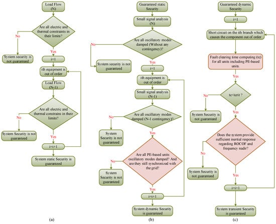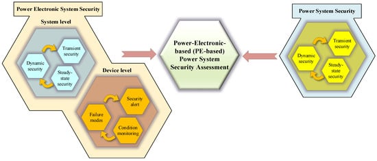 To address the security challenges with the PE-based power systems, the first step is to establish a precise definition of security. The security of a power system is defined as its ability to overcome contingencies, such a severe fault, and deliver the energy to customers in abnormal conditions []. A general scheme of the security assessment of a PE-based power system is shown in Figure 1. A secure system is also a stable one—both during and after a contingency. Therefore, stability assessment of the system is necessary to ensure its security. However, the definition of power system stability is modified by moving from conventional systems to PE-based ones []. In this way, there are some main issues regarding the modern PE-based power systems, which need to be considered: