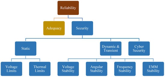 A power system’s reliability is defined as its ability to cope with its demand and withstand any outage and contingency [,]. It is generally divided into two categories, including adequacy and security, as shown in Figure 2 [,]. Adequacy measure represents the ability of a power system to cope with its demand at all times, considering planned and unplanned outages and uncertainties []. The system adequacy is associated with the planning of power systems for long-term facility expansion, short-term marketing, and operational planning, including unit commitment and economic dispatch among available generation systems. Meanwhile, the system is subjected to different kinds of uncertainties within its operations, which may have planned or unplanned sources. It is worth mentioning that the power system security becomes a more challenging issue when information and communication technology (ICT) is counted in the security assessment [].