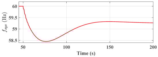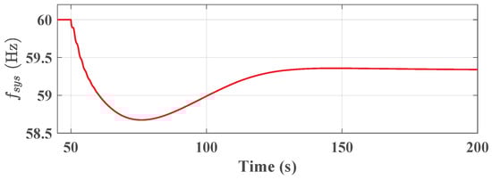 The PE-based power system frequency response to the generator 5 trip at t = 50 s for the PE-based power system case study (case study 2).