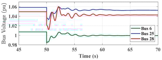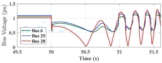 Bus 6, 25, and 28 voltage magnitude responses to generator 5 trip at t = 50 s for the PE-based power system case study (case study 2).