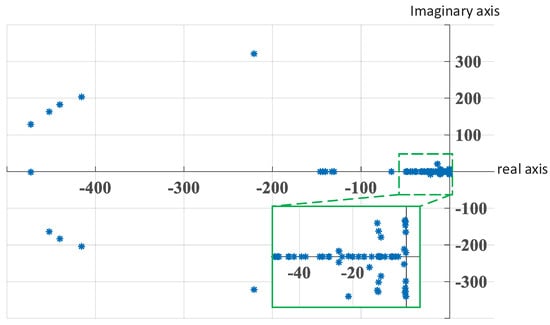 It is worth mentioning that all eigenvalues of the system are on the left-hand-side of the imaginary axis, as shown in Figure 11, which means that the power system is dynamically secure, while its transient stability is not guaranteed; see Figure 3b,c. More specifically, Figure 11 indicates the small-signal stability analysis and does not give any insight into the transient stability assessment. Therefore, while the system can be stable from a small-signal stability point of view (dynamic stability), it might be unstable from a transient stability viewpoint (transient stability).
