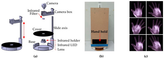 The image acquisition unit is the frontend part of the system, used for capturing a person’s palm image in a contactless way. This is a crucial step, as it affects the complexity of the image preprocessing unit. Capturing high-quality images results in less complexity in the image processing requirements and expectedly yields fewer errors in human recognition. In contrast, low-quality images typically result in more complex image processing and higher error rates. Obtaining high-quality images allows the relevant key points and features to be extracted more effectively. The design of palm imaging systems for human recognition has been an active research topic over the last decade. These systems exploit the concept of the infrared light absorption of deoxyhemoglobin reduced hemoglobin (HbR) in the blood. Most of the systems presented in the literature use NIR [23,41,42,43,44,45] with wavelengths of 750–1500 nm or far infrared (FIR) [23,46] light sources. Figure 2 shows our proposed image acquisition system using an 850-nm wavelength light source. The system can be designed to operate in two modes, i.e., a transmission mode [28,41,47] where the infrared light source and the infrared sensitive camera are installed on opposite sides of the hand, and a reflection mode, [17,19,24,26,48] where the infrared light source and infrared-sensitive camera are aligned on the same side of the hand. We opted to implement a transmission mode configuration, because it is considered to be more resistant to noise [41]. As shown in Figure 2, an infrared LED is installed in the scatter-light protection cylindrical case with a 5 cm diameter and 5 cm height. A concave lens is also installed at the orifice of the cylindrical case to focus the light onto the subject’s hand. On the opposite side of the infrared LED, an 850-nm wavelength IR-filtered camera is installed. For specific usage scenarios, the FUJIKO CCTV is modified with the removal of the IR cut filter to reduce the infrared transmission. Equipped with the replacement of IR filter, it selectively transmits light at a 850 nm wavelength, with an adjustable arm for focal length control. To prevent the scattering of ambient light, the system is also covered with protective plastic, leaving only the front side exposed for hand imaging, as shown in Figure 2b. Samples of IR-radiated vein images are shown in Figure 2c.