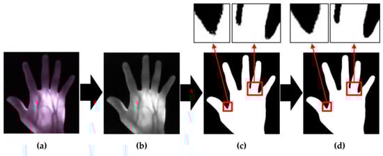 As shown in Figure 3a, the images obtained from the image acquisition are presented in color, consisting of veins that appear darker than the surrounding parts. Image preprocessing is applied to enhance the quality of the acquired images and to ensure the efficacy of the feature extraction process. Based on a global threshold [49], the image is first converted into grayscale and then segmented to extract the hand portion from the background of the image. After that, a 3 × 3 median filter is applied to remove salt-and-pepper noise, together with the opening and closing morphological technique to remove speckled remaining noise. Figure 3c, in the red square frame, shows images with interference, zooming into the finer details before processing them with image enhancement. Figure 3d illustrates a typical output image, with the hand portion in the foreground after the image enhancement.