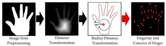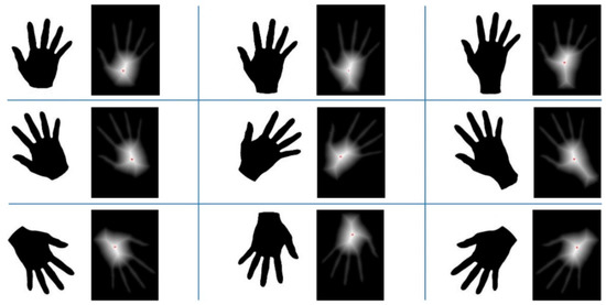 The goal of the hand geometry feature extraction stage is to find the fingertips and concave points (valleys) joining fingers. The obvious characteristic of the tip and the concave point of the fingers is the extremal curvature of the contour around the hand. Therefore, most methods of finding the distal and concave points of the fingers are obtained from the curvature of the hand contour [17,18,50]. Fingertip points can also be identified using the convex hulls of the binary palm image. Once the fingertip point is located, the concave point is further identified by measuring the distance between the midpoint of each fingertip point to the concave point, known as the convexity defection [50,51]. In this research, we exploit the radius transform by measuring the distance between the hand centroid to the hand contour. The fingertip and the concave point yield the maximal and minimal radius distance, respectively. To find the hand centroid, a distance map method is applied. As shown in Figure 4, the point with maximal distance represents the hand centroid. Figure 5 demonstrates the robustness of this centroid detection with various hand geometric transformations. Once the centroid is located, the Euclidian distance between the centroid and the hand contours—the so-called radius distance—is computed using Equation (1).