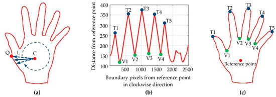 As shown below, Figure 6a shows a centroid detected with the distance transform process. Figure 6b shows a plot of the radius distance. From the graph of radius distance, the fiducial points, including fingertip and concave points, can be located by finding the extremal points. The fingertip points will be the five points of maximal radius distance, denoted respectively as T1–T5, while the concave point will be the four minimal radius distance points, denoted respectively as V1–V4 (local minima point, Vn = Min(Tn: Tn+1)). The detected fingertip and the concave points are shown in Figure 6c.