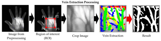 The vein pattern extraction process is started by converting the color palm image from the image acquisition system into a grayscale image. Veins in the grayscale image appear dark, as deoxyhemoglobin contained within the blood inside the veins absorbs more infrared light. As a result, less infrared light is transmitted to the IR-sensitive camera. Vein extraction from the grayscale image is subdivided into two steps: (i) region of interest (ROI) extraction and (ii) vein extraction. The process of vein extraction is shown in Figure 7.