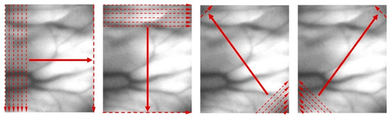 Figure 11 depicts the vein extraction process. The intensity profile is shown in Figure 11a; after applying Equation (4), the graph of curvature was produced, as shown in Figure 11c. To mitigate noise disturbance, the curvature threshold is set as annotated with solid lines in Figure 11c. Curvatures exceeding this threshold are considered as veins. The maximum point of curvature is equivalent to the center of the vein, identified as Px in Figure 11e. Points where the curvature crosses the threshold line determine the width of the vein detected in that vicinity, illustrated as Wx in Figure 11e. Pixels lying within this region are labeled as vein portions, whereas those lying outside this region are classified as non-vein portion pixels. To improve the accuracy of vein detection, this algorithm is repeated for intensity profiles computed in four directions (Figure 9). The resulting images detected from all intensity profiles are then combined to yield the final vein image. Figure 12 demonstrates the vein image detection from four directional intensity profiles computed using the described algorithm.