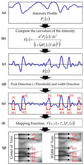 Vein extraction process: (a) intensity profile of vein image; (b) compute the curvature of the intensity; (c) curvature of the intensity; (d) compute peak detection and width detection; (e) peak and width detection’s position; (f) mapping function of (a) and (e); and (g) result of vein extraction.