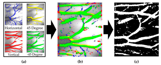Vein image detection: (a) Results from four directional intensity profiles; (b) combined vein image; (c) final classified vein image.