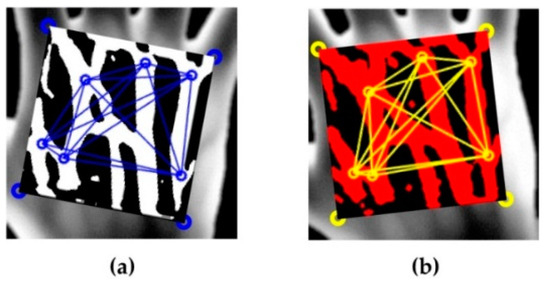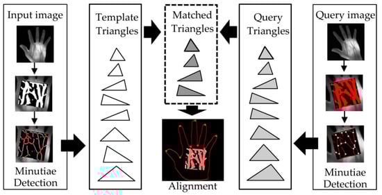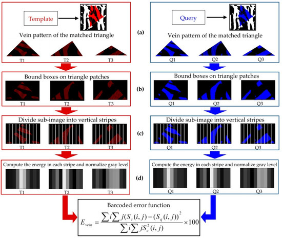 - Obtain the set of triangles for the template and the query vein pattern using a triangulation process. These sets are shown in Figure 16a,g, respectively.
