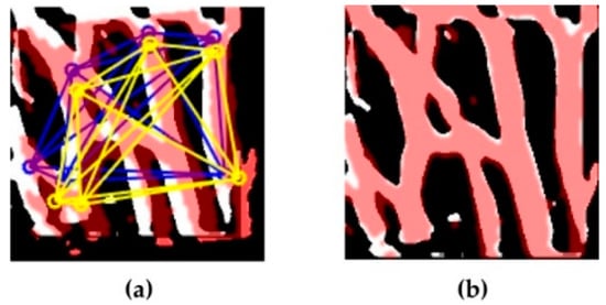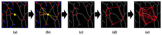 Figure 13. Minutia extraction: (a) vein image; (b) morphological closing operation; (c) morphological thinning; (d) morphological pruning; and (e) result of minutia extraction. - (ii)