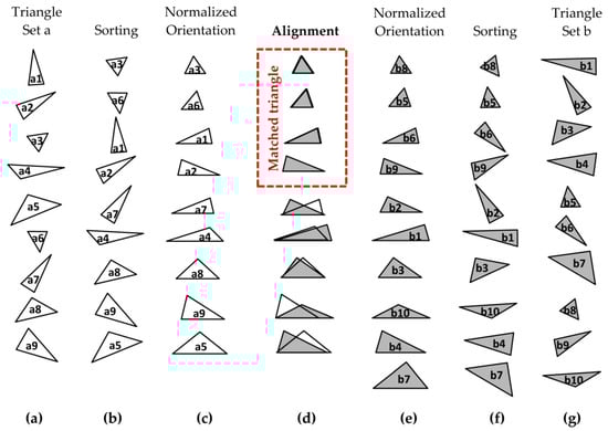 - Sort the triangles of each set in ascending order, as shown in Figure 16b,f, respectively.