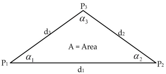 Figure 17. Definition of the parameters in feature vector F; di is the corresponding length of triangle, αi is the corresponding angle and A is the area of triangle. - (5)