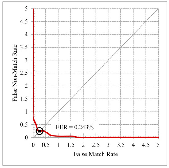 The limits of the roll and pitch angles are within ±20, while that of the yaw angle is 0–180°. The total number of images is 1400 (140 × 10) images. The number of genuine matches is 6300 matches (45 possible pairs of vein patterns coming from the same hand × 140 individuals = 6300) and the number of impostor matches is 9730 matches ((140 × 139/2) possible pairs of template vein patterns coming from the different vein patterns). The distribution of matching scores is generated in a set of two parallel images—images obtained from the same hand (red line on the right) and the ones from different hands (blue line on the left), as shown in Figure 27, where the cross-over point of the false non match rate (FNMR) curve and the false match rate (FMR) curve is 0.607.