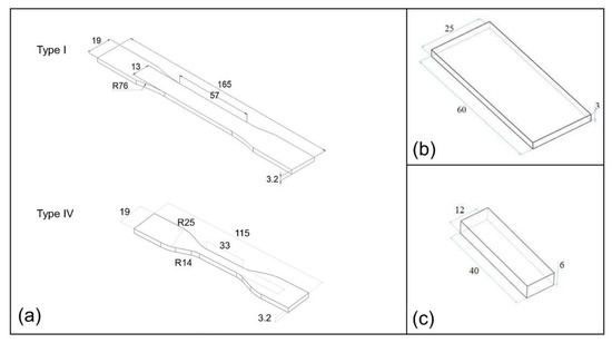 Dimensions (in mm) of the specimens. (a) Tensile test specimens (ASTM D638 type I, IV); (b) flexural test specimens; (c) short-beam shear specimens.