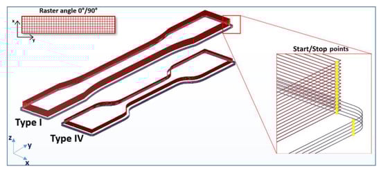 The selected printing settings are summarized in Table 2. These parameters were selected according to past experience to minimize the presence of internal voids [19]. All the specimens were oriented flatwise on the XY plane. To avoid negative notch effects leading to premature failure, as reported in some previous research [3], the start and stop positions for printing the tensile specimens were set in one corner in the grip zone (Figure 2).