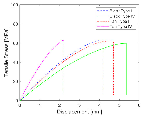 After generating the experimental plan and collecting the response observations (Table S1) of the tensile test according to the ASTM D638 standard (UTS and Young’s modulus), an ANOVA study was performed using the Design-Expert software. Randomization was used for the testing sequence, as reported in Table S1 in the Supplementary Material. The average tensile stress of the five tested samples versus displacement curves are shown in Figure 5. All the tested specimens showed brittle failure with no yielding. The UTS varied in the range between 48.99 MPa and 61.98 MPa for the two materials. Young’s modulus varied in the range between 2.05 GPa and 2.34 GPa. The measured tensile properties were similar to those reported in other papers focusing on ULTEMTM 9085 [16,27,28,29]. Zaldivar et al. [29] showed tensile strength values varying from 46.83 MPa for flat samples to 71.03 MPa for on-edge samples. The tensile modulus varied from 1.77 GPa to 2.48 GPa. In this study, the raster orientation varied from 90° to 0°. Similarly, Byberg et al. [28] reported tensile strength values from 31.30 MPa to 70.60 MPa. FDM™ samples show lower mechanical properties, in particular the UTS reduction ranges between 20–40% and the strain of about 2% [30]. These findings depend on the presence of voids and on the thermal history of the printed samples when compared to injection molded specimens.