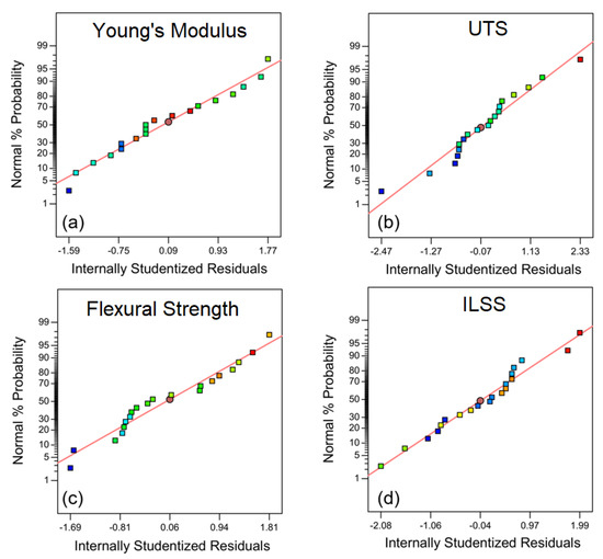 Normal probability plot for: (a) Young’s modulus; (b) ultimate tensile strength; (c) flexural strength; and (d) interlaminar shear strength.
