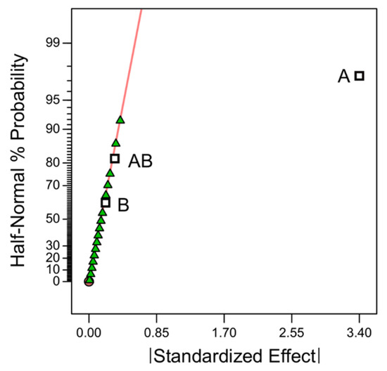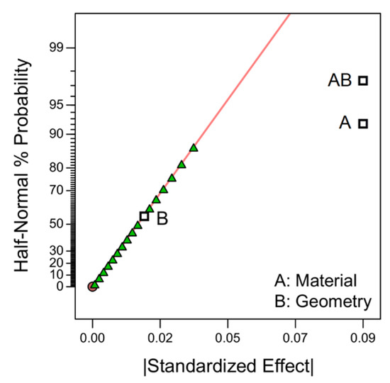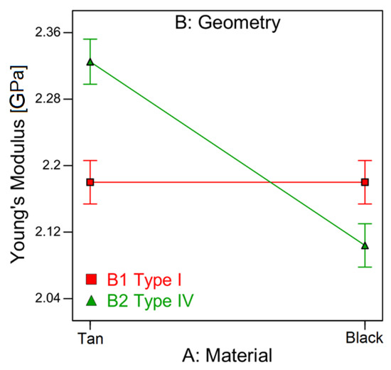 The Analysis of Variance (ANOVA) table for Young’s modulus response is shown in Table 3. Model adequacy checking on the residuals from the analysis did not show any anomaly, as shown in Figure 6 The material type (factor A) is an influential factor (p-value < 0.001) on Young’s modulus (Figure 7, Table 3) and it is involved in a significant interaction AB (p-value < 0.001) with the geometry (factor B) (Figure 8). The model appears to have a good robustness to define the observed response with a high R-squared value of 0.8368. Conversely, when the UTS response is considered as the response variable, the ANOVA analysis shows that the material and the geometry factors do not influence it (Table 4). The tensile test is actually unable to characterize the ultimate tensile strength (UTS) for the two materials, as revealed by the very low R-squared value of 0.0764 We explain this finding by considering that the tensile test for flatwise printed specimens is not as sensitive to the interlayer bonding as it is for the upright orientation case where interlayers are directly loaded. In fact, for flatwise samples the longitudinally oriented rasters can sustain applied loads.