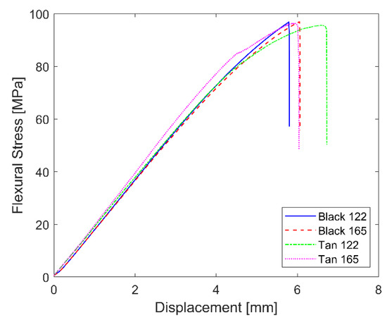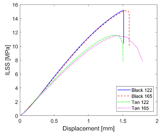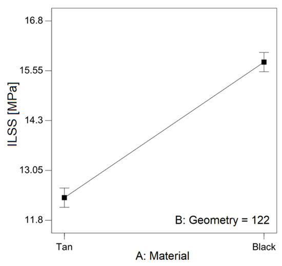 Among the different test options typically used to characterize fiber-reinforced polymers, the SBS test is a valid option to easily determine the ILSS. For this test, the span-to-thickness ratio is fixed at values in the order that the occurring shear stresses within the specimen are high compared to the normal stresses generated by the bending moment [33]. The average ILSS versus displacement curves obtained for the ULTEMTM 9085 samples are shown in Figure 11 (also see Table S3). From these curves, it is immediately evident the effect of the material type, with the black resin showing higher SBS than the tan resin. For all the tested specimens, the readings of SBS varied in the range between 11.82 MPa and 16.74 MPa. The results of the ANOVA analysis for the experimental plan and the normal probability plot of the effects are shown in Table 6 and Figure 12, respectively. Model adequacy checking on the residuals from the analysis did not show any anomaly. As expected, the material type is clearly the influent factor (p-value < 0.0001) on the ILSS. Neither the geometry nor the second-order interaction between the material type and geometry were significant. However, a very high portion of variability (more than 90%), is found for the material type with R-squared = 0.92 and adjusted R-squared = 0.92. The main effects diagram shown in Figure 13 on the material type factor clearly shows its influence. The two black square points and the intervals on the diagram correspond to the average of the ILSS observations and the 95% confidence intervals for the mean ILSS for tan and black, respectively. The same result was obtained when plotting the main effects diagram for level 165 mm (not shown here).